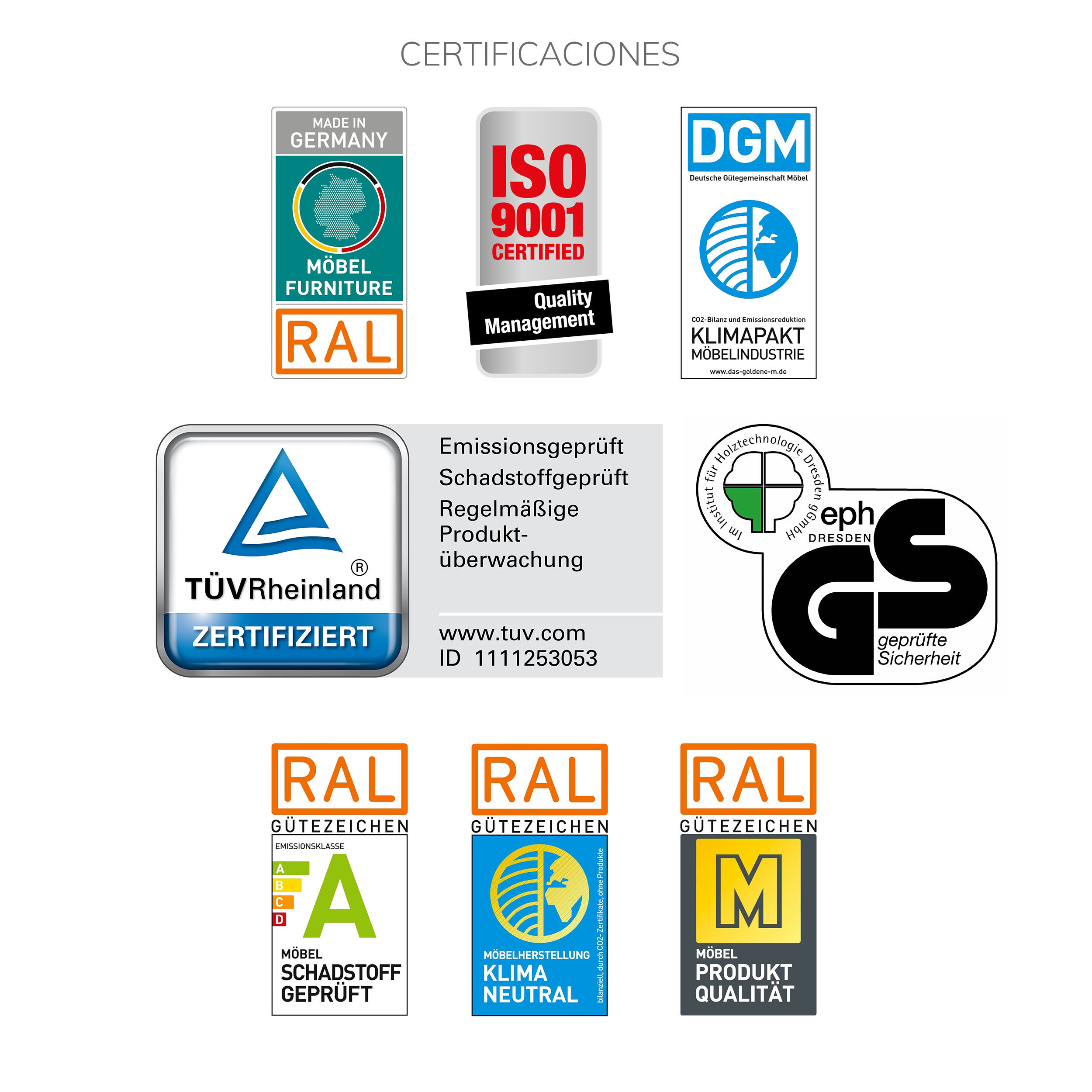 Disponemos de todas las CERTIFICACIONES de fabricación alemana. Y es nuestro compromiso con la sociedad, certificar que las materias primas utilizadas, se han obtenido en bosques sostenibles y bajo una gestión forestal apropiada, que aseguran la supervivencia futura del bosque y mejora la calidad de su flora y fauna.